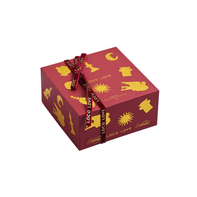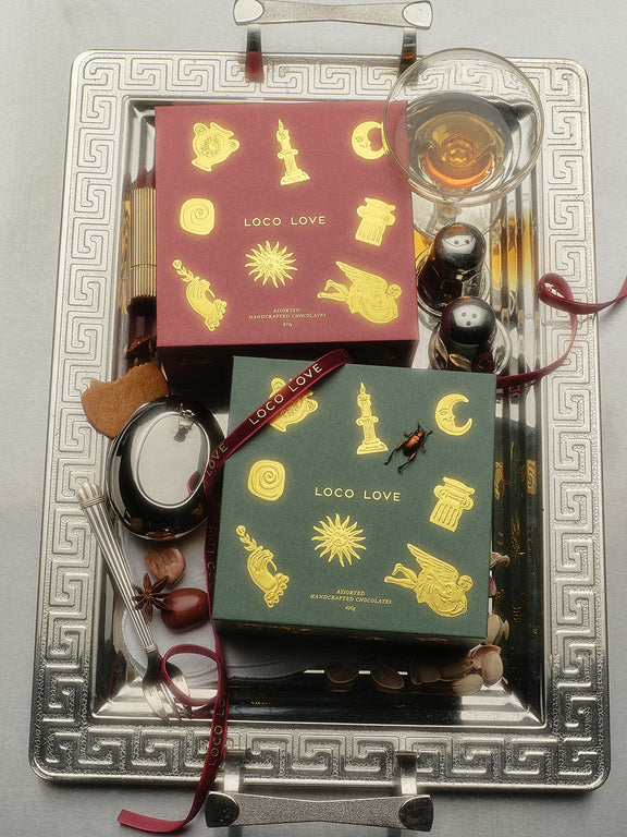 If gifting is your love language, if generosity calls to your heart; this opulent box of edible treasures was made for you. Gently untie the ribbon and slowly lift the lid. Two tiers of chocolates greet you, the air filling with the aroma of rich cacao and a hint of something holy. Discover 12 festive chocolates tucked inside a gorgeous keepsake box, available in two colour ways.